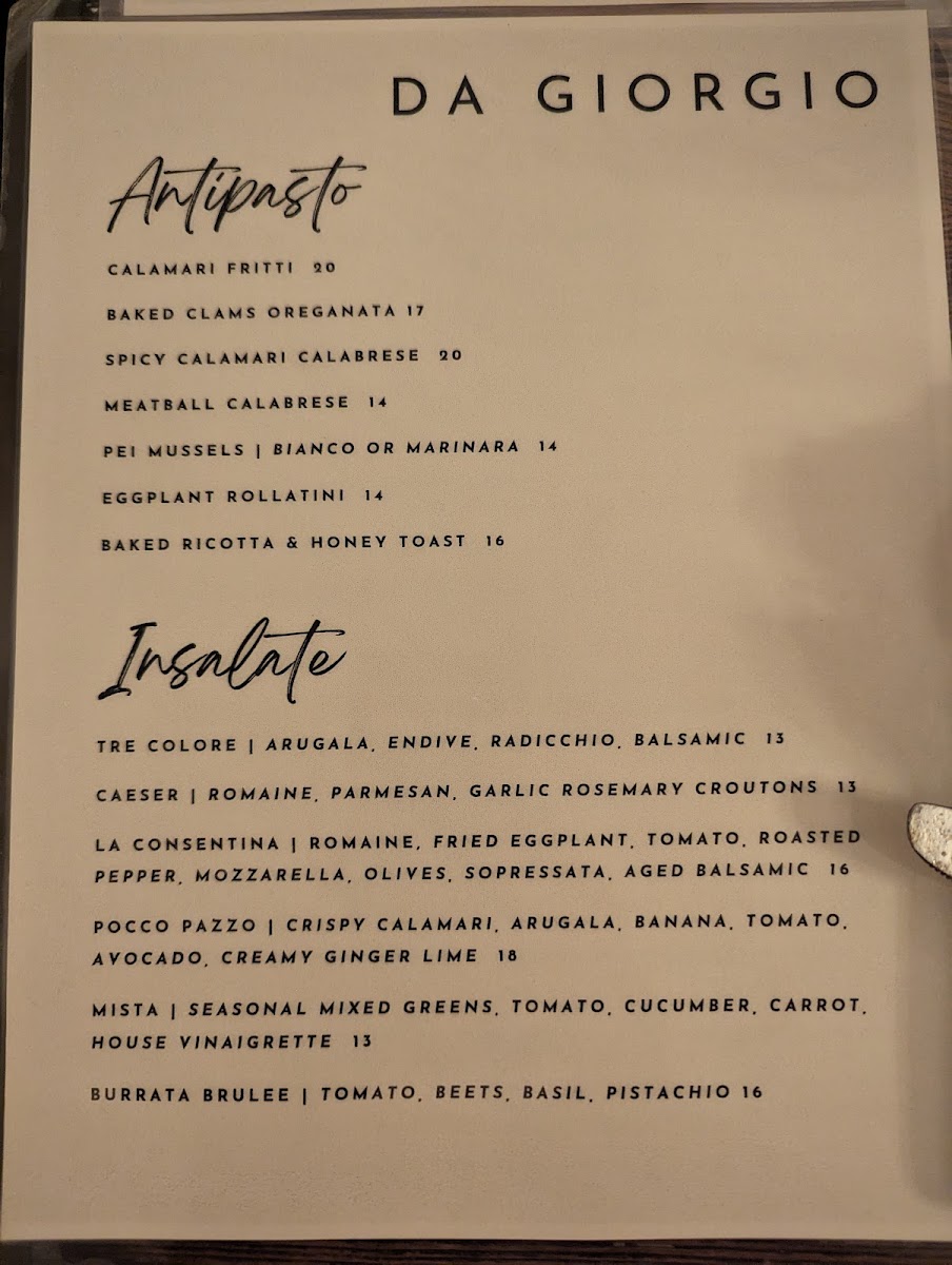 The menu offers an array of authentic dishes, each reflecting Chef Giorgio Giacinto's Calabrian roots. Highlights include the Stuffed Meatball Calabrese, a rich mix of beef, veal, and pork, and the stunning Squid Ink Spaghetti with Crab, which is both beautifully al dente and deeply flavorful. Don’t miss the Grandmas Chicken and the savory Rigatoni Da Giorgio with filet mignon chunks in cognac sauce.